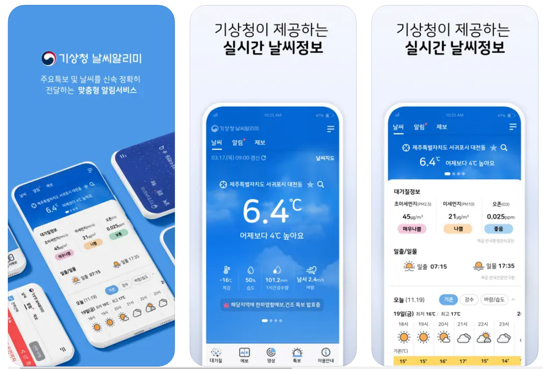 기상청 날씨알리미는 기상청에서 실시간으로 직접 날씨 정보를 제공해준다는 장점이 있죠, 또한 다른 날씨 앱은 광고가 많은 반면 기상청 날씨알리미 앱은 그럴 걱정이 없습니다. 그런의미에서 저는 날씨를 자주 확인하신다면 기상청 날씨알리미 앱을 다운받는 것을 추천드립니다.