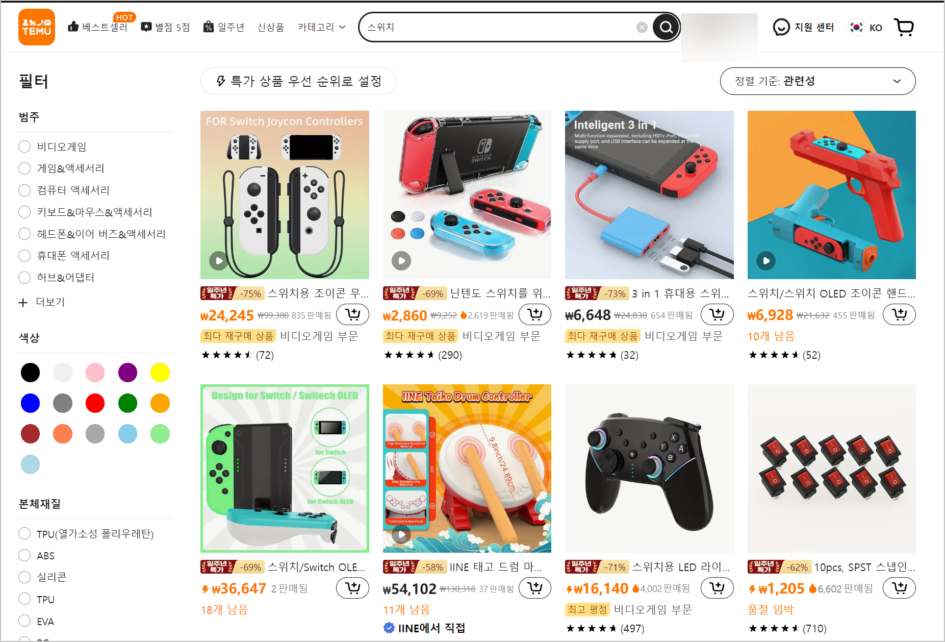 각종 악세사리만 난무하고 본기계는 안파는 겁니다. 물론 알고 있습니다. 이거 저렴한 가성비 제품도 많이 있다는거 알고 있는데, 뭔가 사기를 당한거 같아서 기분이 별로더라고요. 그리고 왼쪽 첫번째꺼 조이콘 이거 호환제품입니다. 처음에 정품인줄 알고 들어갔는데, 가봤더니 리뷰에 호환이라고 써있더라고요. 실수로 구매할뻔 했습니다.