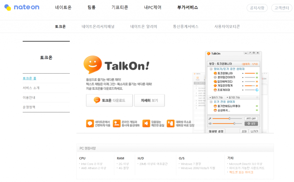 토크온은 마이크와 헤드셋을 이용해 음성 채팅을 즐길 수 있는 서비스로, 네이트온과 연동되어 네이트온 아이디가 있으면 누구나 이용할 수 있습니다. 이 서비스는 주로 온라인 게임을 할 때 사용됩니다. 사실 지금은 그렇게 많이 이용하는 것 같진 않습니다.